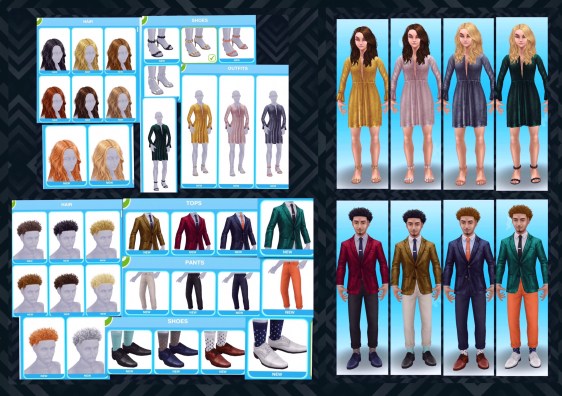 4 outfits (dresses), 4 shoes and 8 hairstyles for female adult sims for free in the wardrobe