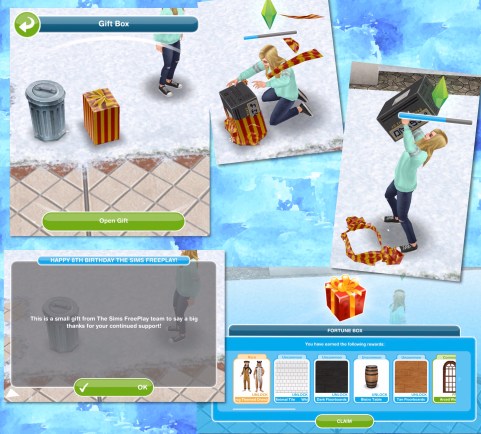 The 15th December is the 8th birthday of The Sims Freeplay! You may have already found the gift at the front of one of your sims houses, if not remember to open the gift to get a free fortune box to celebrate before the end of this update: