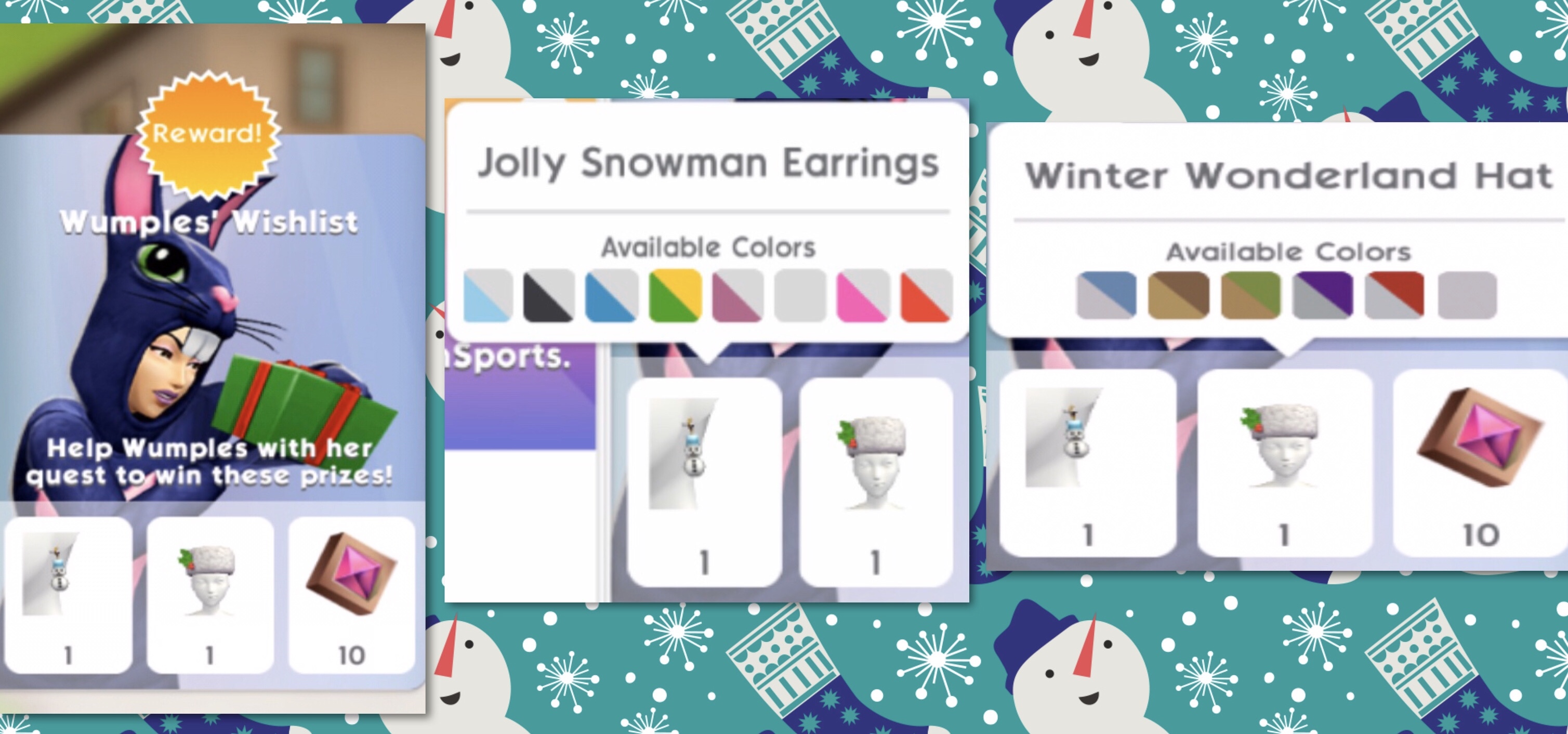 Wumples has come from The Sims Freeplay to see what is going on in The Sims Mobile and she has brought with her a new quest Wumples Wishlist! Completing this limited time quest in the 4 day time limit unlocks the jolly snowman earrings, winter wonderland hat and 10 fashion gems.