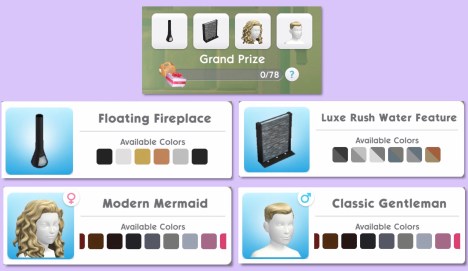 If you unlock all the boxes (78 in total) you will unlock the grand prizes which are the Floating Fireplace, Luxe Rush Water Feature, Modern Mermaid hairstyle for female adult sims and Classic Gentleman hairstyle for male adult sims: