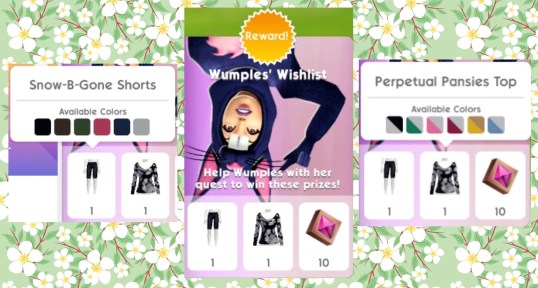 Wumples has come from The Sims Freeplay to see what is going on in The Sims Mobile and she has brought with her a new quest Wumples Wishlist! Completing this limited time quest in the 5 day time limit unlocks the Perpetual Pansies Top, Snow-B-Gone Shorts and 10 Fashion Gems