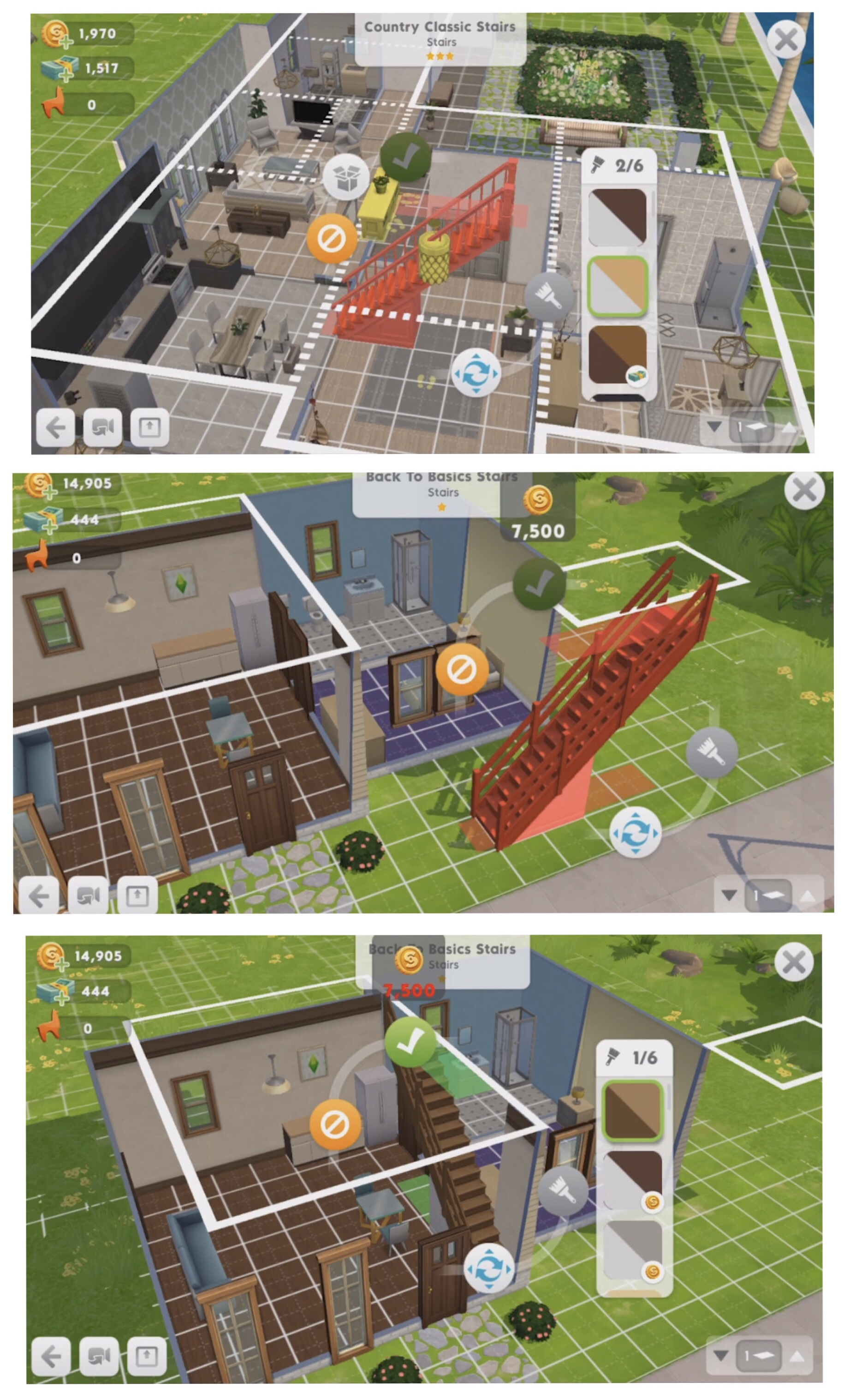 - Yellow Patches– these appear when you are trying to place the stairs on top of another item, if you click the green tick to place the stairs there those items will be moved to your storage. This is going to save a lot of time, rather than cancelling placing the stairs and storing those items yourself it can all be achieved in one click.