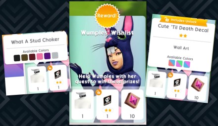 Wumples has come from The Sims Freeplay to see what is going on in The Sims Mobile and she has brought with her a new quest Wumples Wishlist! Completing this limited time quest in the 5 day time limit unlocks the Cute ‘Til Death Decal, What a Stud Choker and 10 Fashion Gems