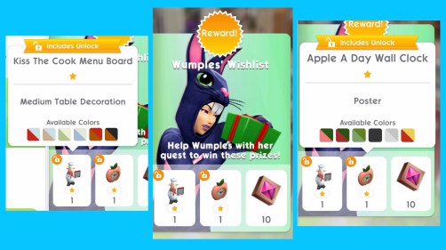 Wumples has come from The Sims Freeplay to see what is going on in The Sims Mobile and she has brought with her a new quest Wumples Wishlist! Completing this limited time quest in the 5 day time limit unlocks the Apple A Day Wall Clock, Kiss the Cook Menu Board and 10 Fashion Gems.