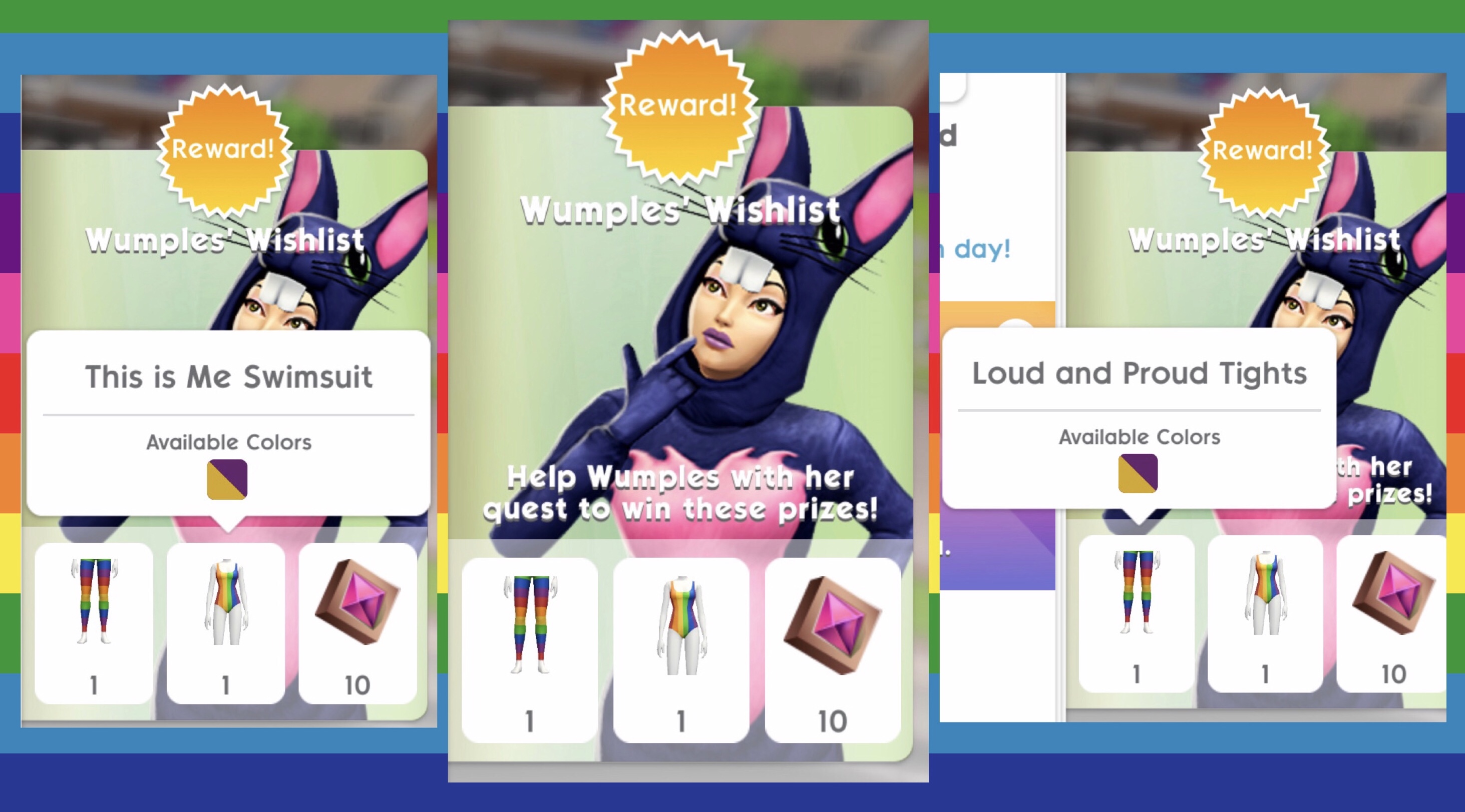 Wumples has come from The Sims Freeplay to see what is going on in The Sims Mobile and she has brought with her the Pride Wumples Wishlist Quest! Completing this limited time quest in the 7 day time limit unlocks the This is Me Swimsuit, Loud and Proud Leggings and 10 Fashion Gems.