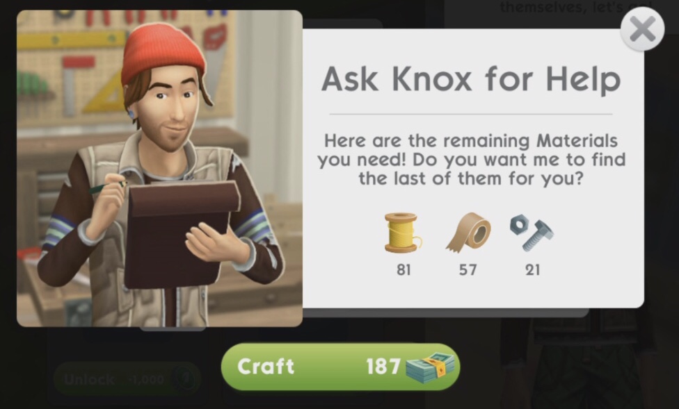If you get to Sunday and don’t think you are going to have enough you can ask Knox for help, this costs simcash to buy the missing materials: