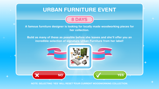 The Urban Furniture Event is back for 8 days from the 23rd September! To get all the furniture you need to complete the woodworking hobby collection 7 times. You get a furniture pack at random each time you complete it, once you unlock a furniture pack you get to keep it even if you don’t find them all. If you have never done the woodworking hobby click here for details.