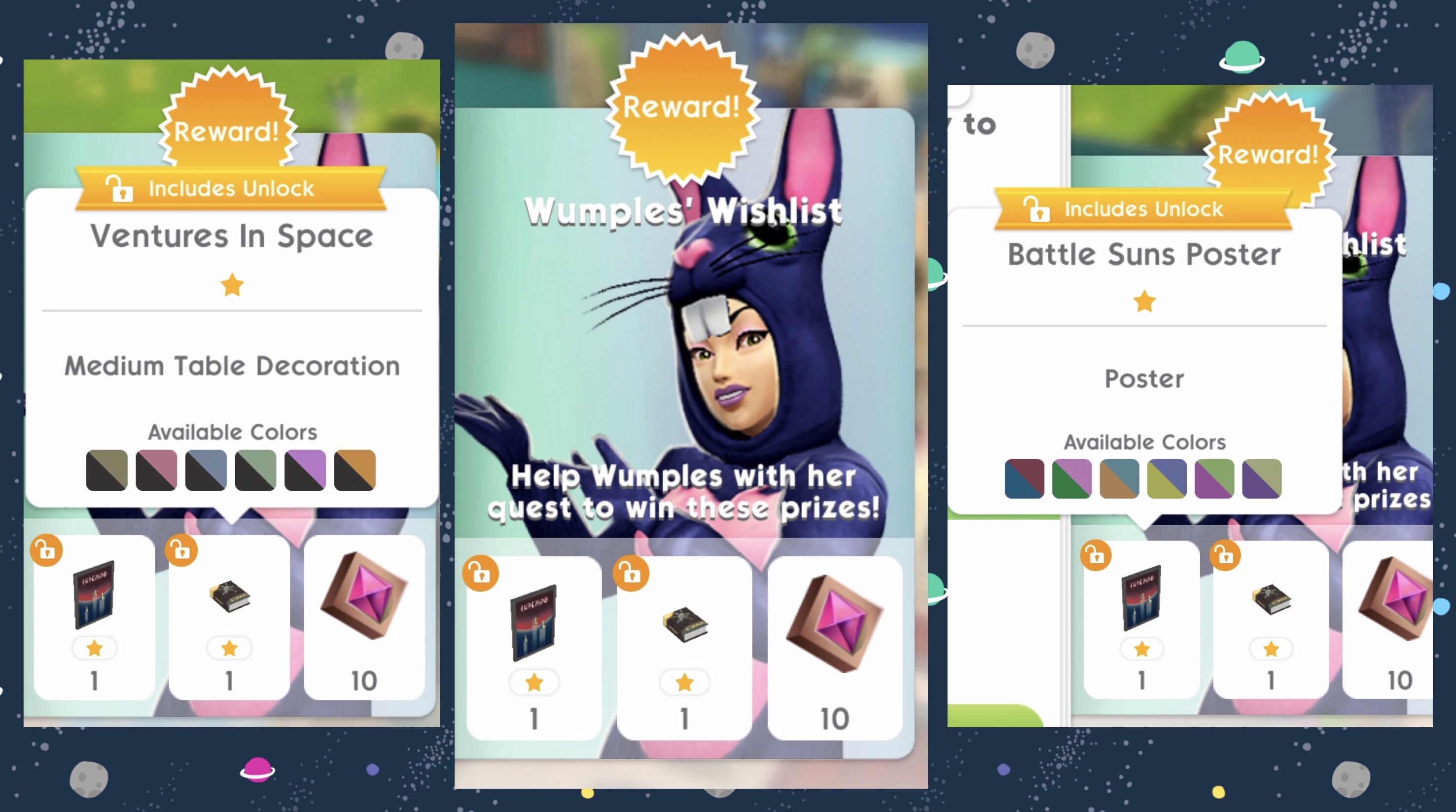 Wumples has come from The Sims Freeplay to see what is going on in The Sims Mobile and she has brought with her a new quest Wumples Wishlist! Completing this limited time quest in the 5 day time limit unlocks the Ventures In Space Book, Battle Suns Poster and 10 Fashion Gems.