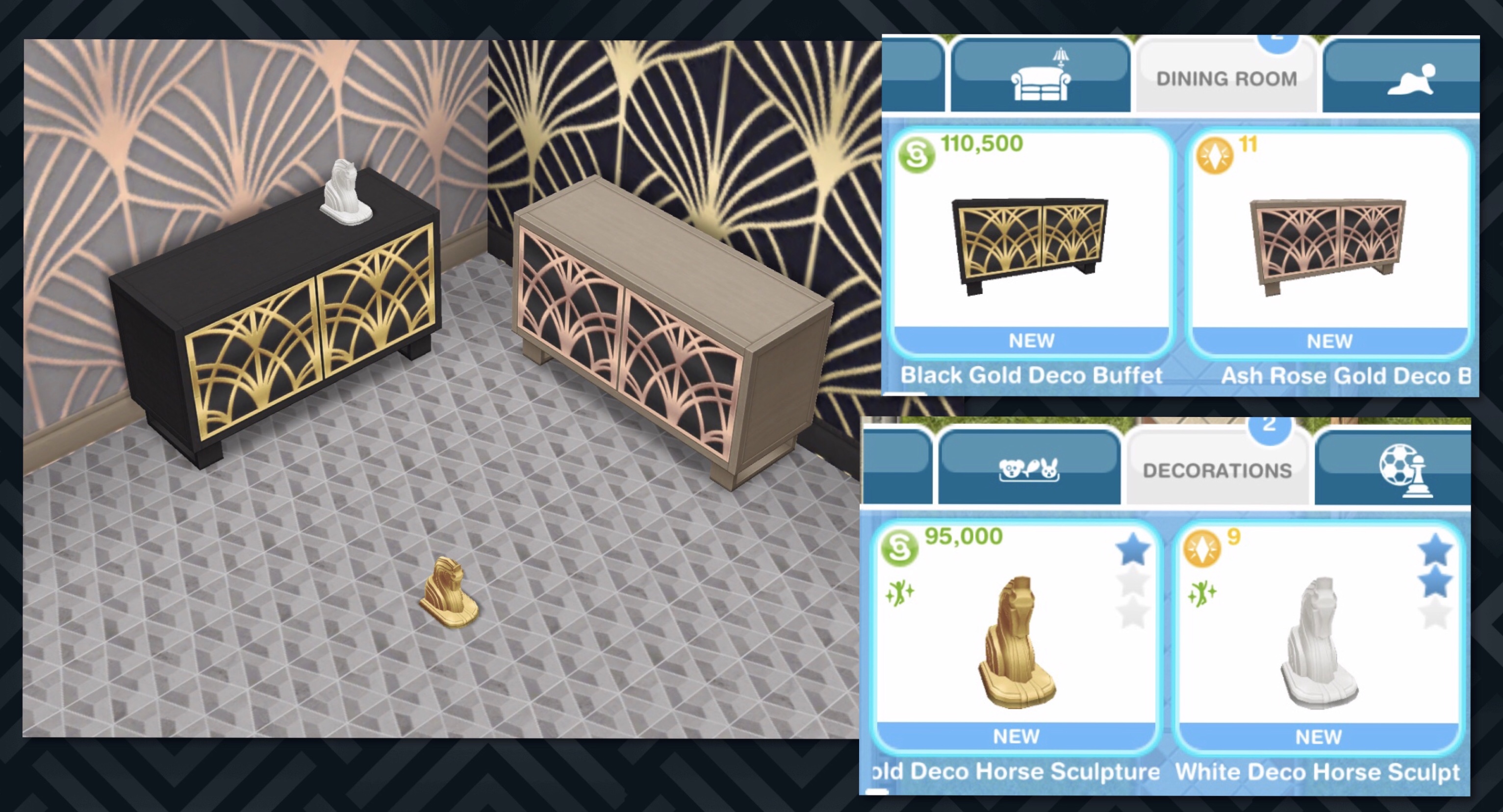 Dining Room Section: Black Gold (S110,500) and Ash Rose Gold (11LP) Deco Buffets
