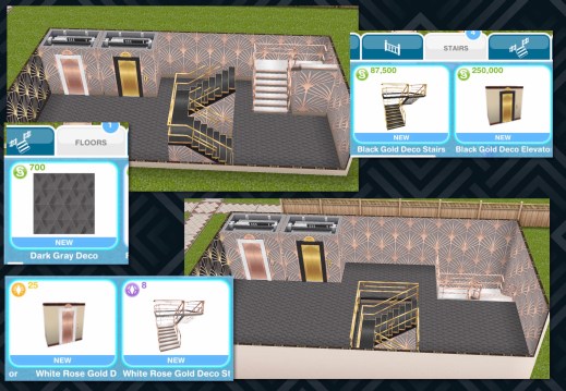 Stairs Section: Black Gold (S87,500) and White Rose Gold (8SP) Deco Stairs and Black Gold (S250,000) and White Rose Gold (25LP) Deco Elevators