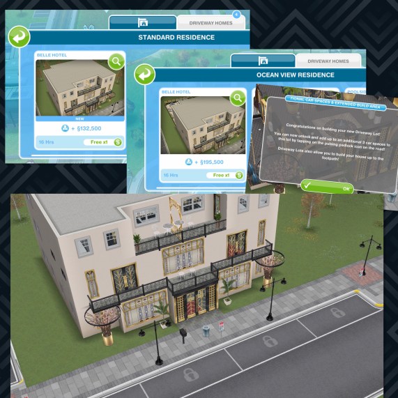 This template can be found under the driveway homes tab and built on a standard or premium residence, the first one is free then they cost simoleons depending on how many houses you have already built. You can add up to 4 cars to this house lot!