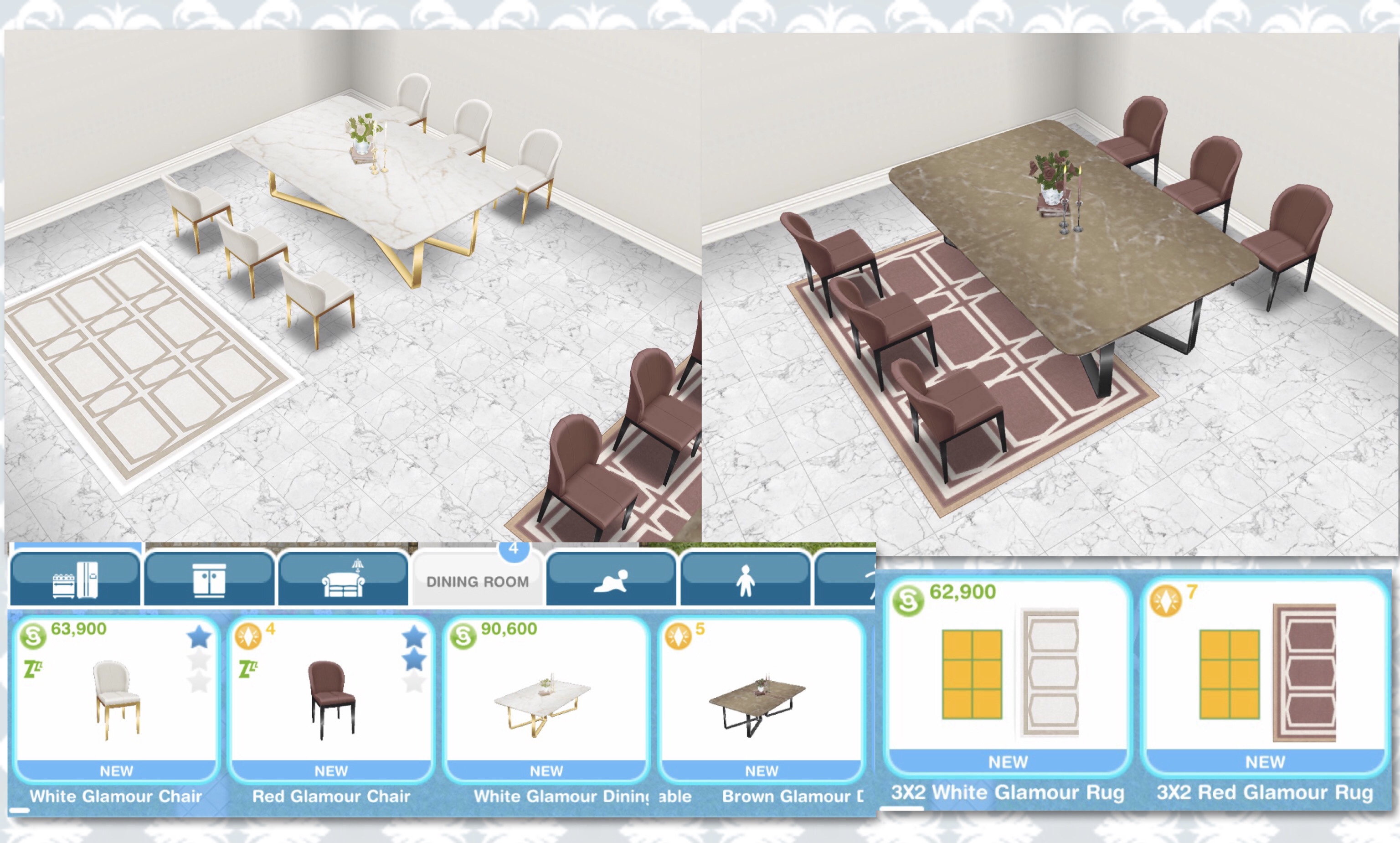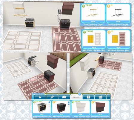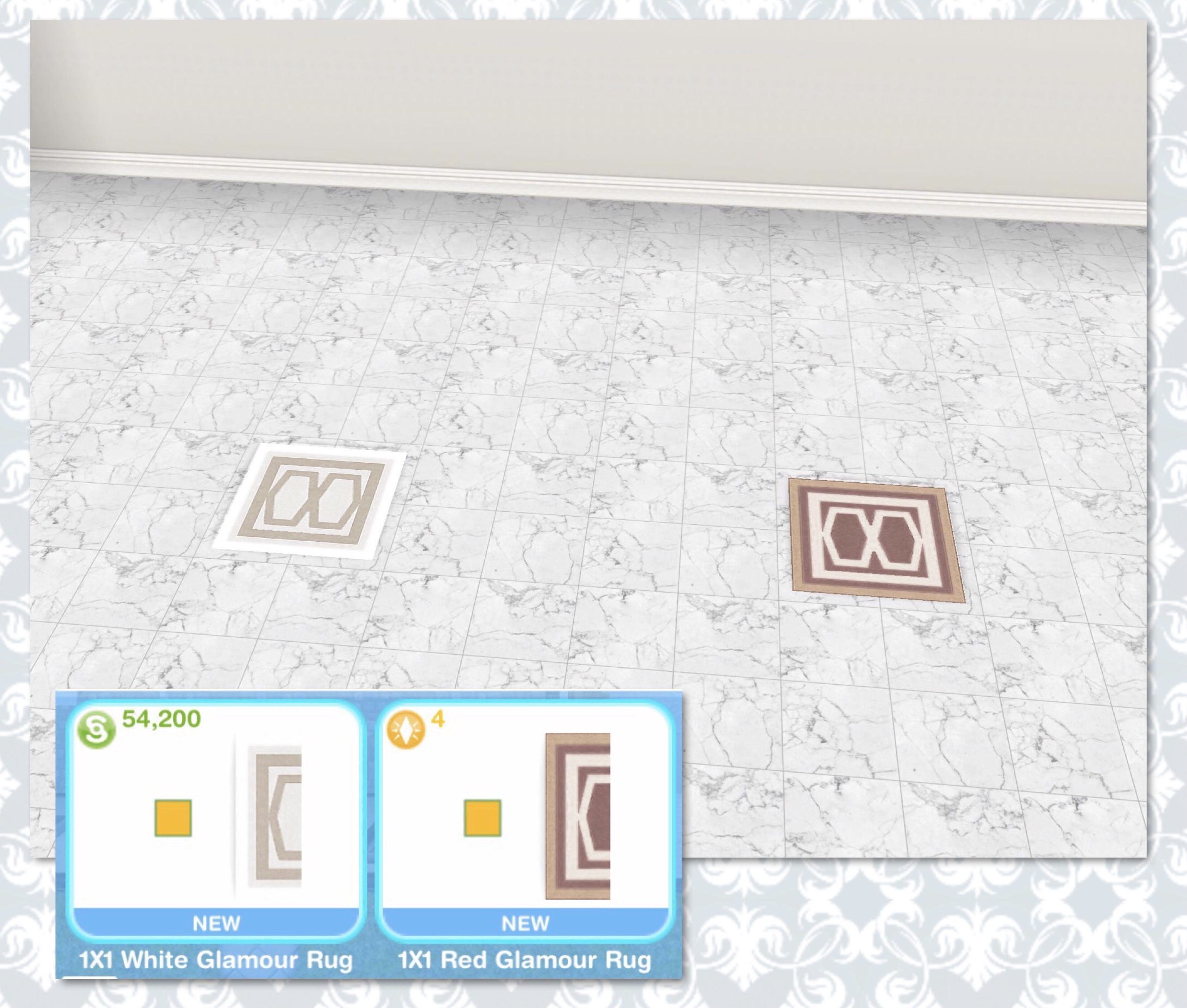 Rugs Section: 1×1 White (S54,200) and Red (4LP) Glamour Rugs