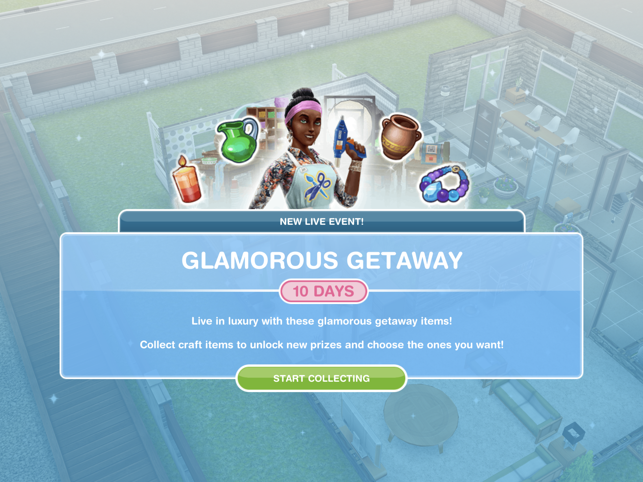 Complete this brand new live event (starts 5th September 2022) to unlock glamorous themed items and if you complete the whole event in the time limit you unlock the Glamorous Getaway house template. This event is only here for 10 days and the aim of it is to collect enough arts and crafts items from the arts and crafts stations (found in the event tab of buy mode) to unlock all the items in this event.