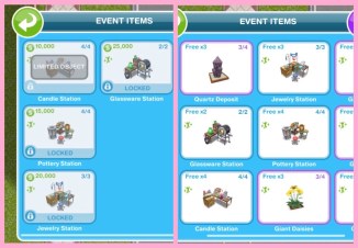 Laura Craft? You may have noticed at the front of one of your houses there is a board with a bubble of a person holding arts and crafts items above it, this is Laura Craft, you can buy her for real money to help you complete the event. When you buy her, you select the item you want her to make from the options: 200 candles, 300 pottery, 450 jewelry or 500 glassware (the amounts seem to differ for most of you and I have no idea why that is!) (you will unlock all the options once you have unlocked all the stations) and you will be able to collect them after 2 hours.