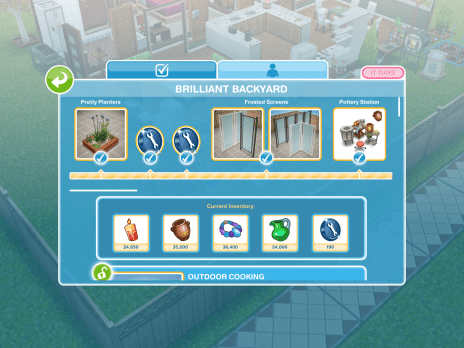 Outdoor Kitchen Cabinets- requires 13,000 pottery, 13,500 jewelry, 13,500 glassware and 130 constructor coins to buy