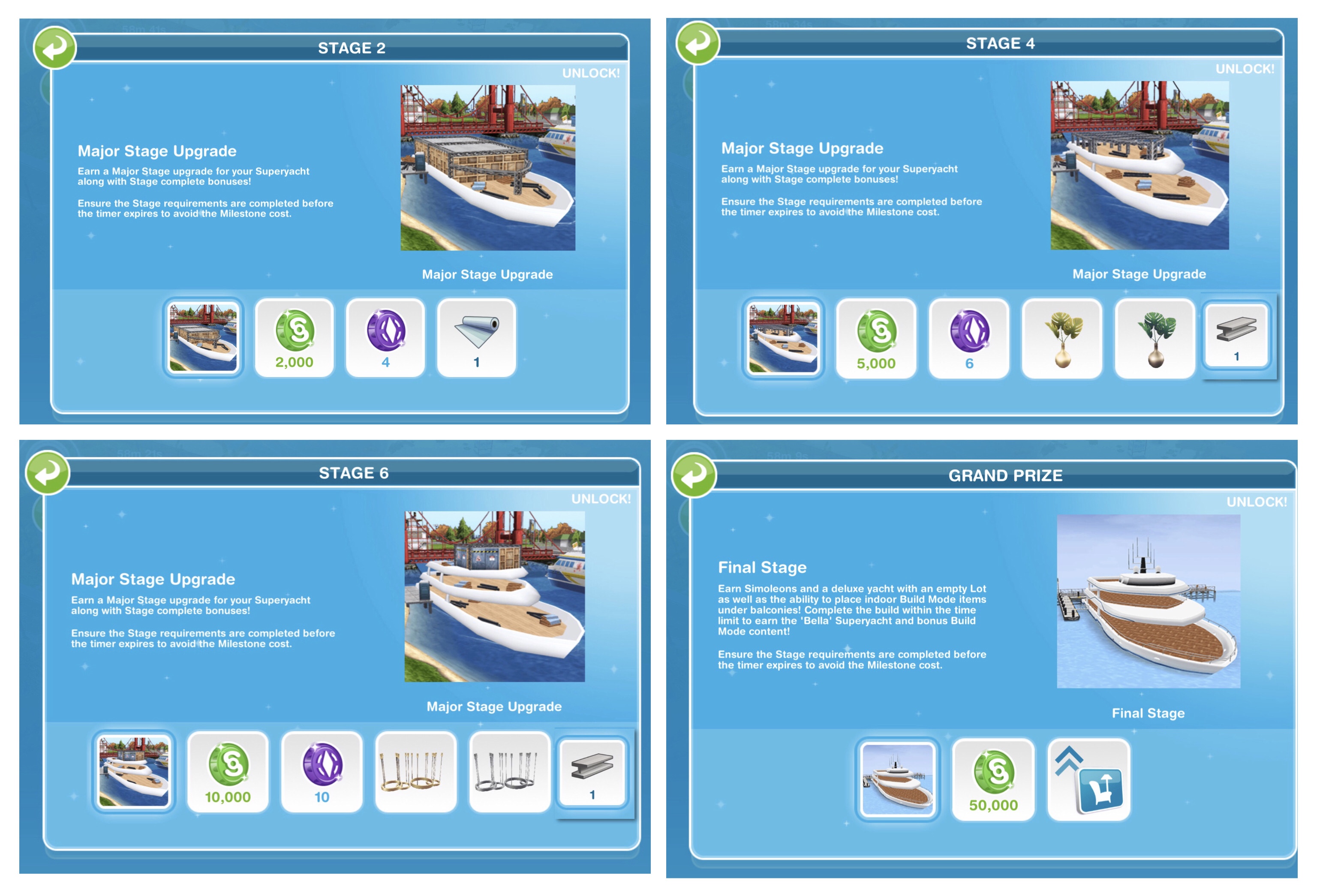 SuperYacht 1: If you complete the final stage in the 15 day time limit you will unlock the Bella Superyacht, you still unlock the super yacht lot if you don’t complete this event in the time limit, once complete you will be able to build the empty Bella Superyacht: