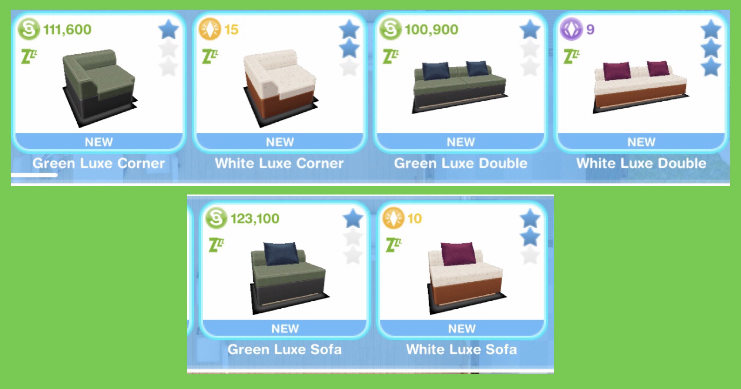 • Stage 4- Green (S123,100) and White (10LP) Luxe Sofas (living room section)