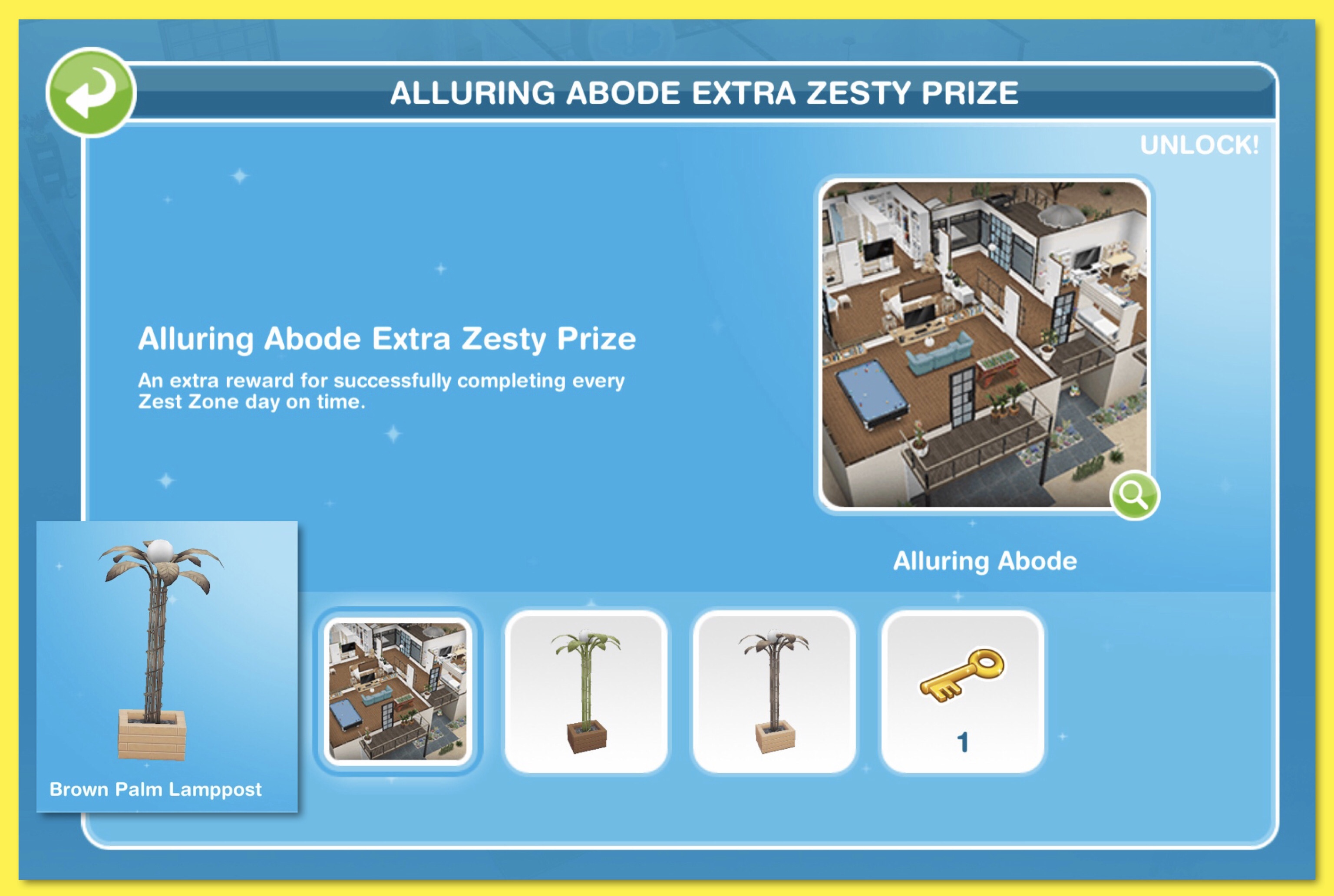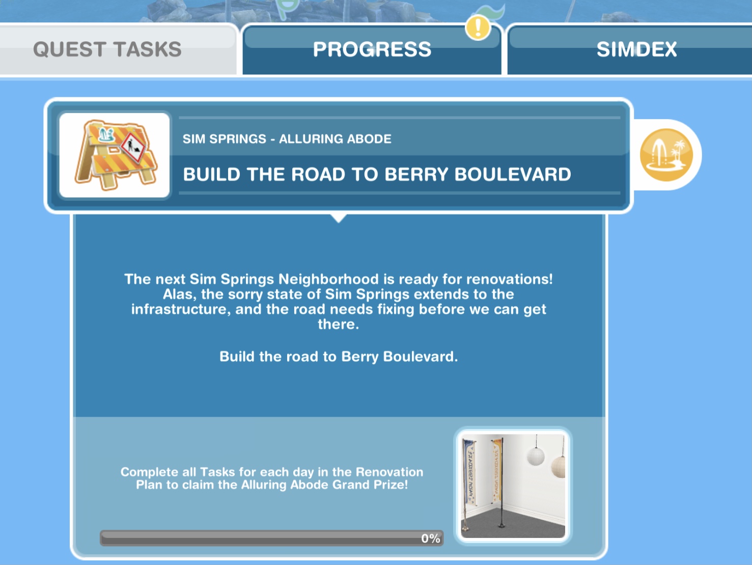 The lots need to be renovated in the order listed above, you cannot do up more than one lot at a time and the next won’t unlock until the previous one has been completed. The time limit to complete a house is 10 days (14 days for community lot) with tasks to complete each day in Sim Springs, similar to Downtown Developer Events if you don’t complete in the time limit you will have to pay to be able to move on but there are prizes available, the extra zesty prizes contains a house template that can be placed in Sim Springs or Simtown.