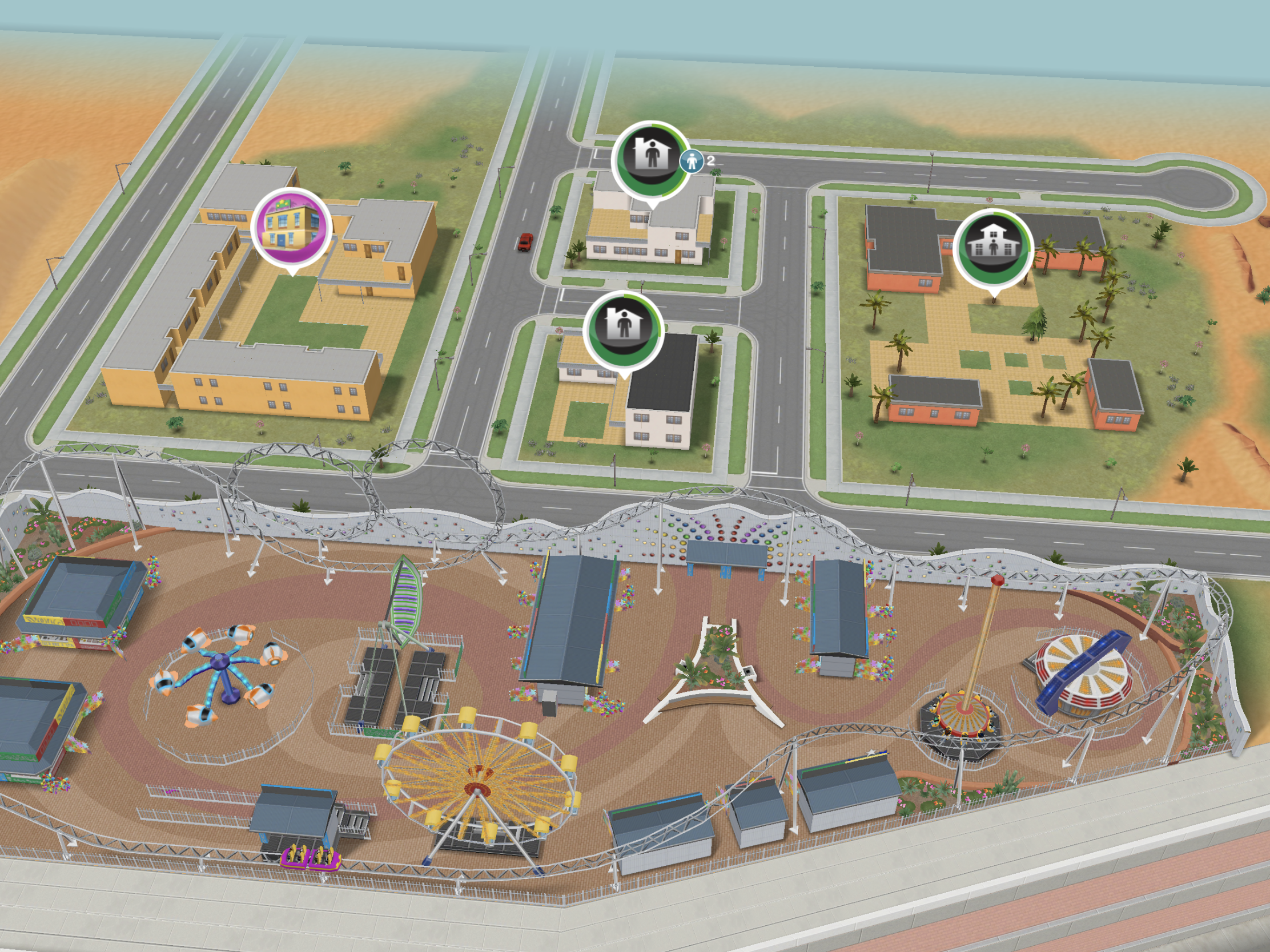 • Once Palm Promenade is complete and you are level 38 or over you will get the task to ‘Build the Road to Berry Boulevard’ click on the orange Sim Springs symbol on the task or the bus stop in Simtown to go to Sim Springs: