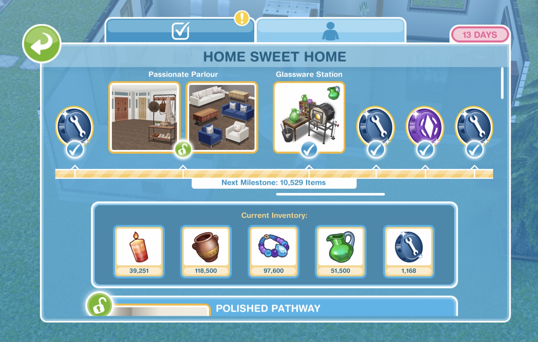 Here you will see you have collected enough items to unlock the Polished Pathway pack. When you unlock each pack, before the items are available in your home store you need to purchase them with the arts and crafts items you make- this goal is coming up!
