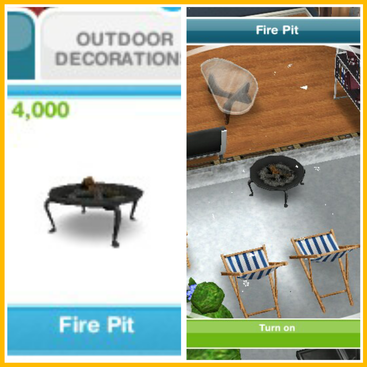 - Turn on a firepit (if you don’t have a firepit you need to buy one from the outdoor decorations section and place it at one of your sims houses to turn on)