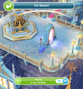 • Party at the ice palace- 2 hours 16 minutes (click on the ice queen) it does say you can invite more sims but can be completed with just one sim