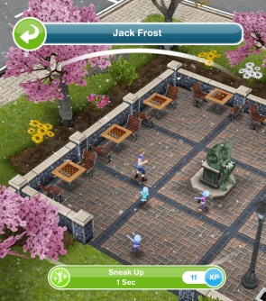 • Sneak up on Jack- 1 second (if blue footprints appear try having your sim move away from Jack before selecting the task or send a sim to the ice palace, they should follow then go back to the park)