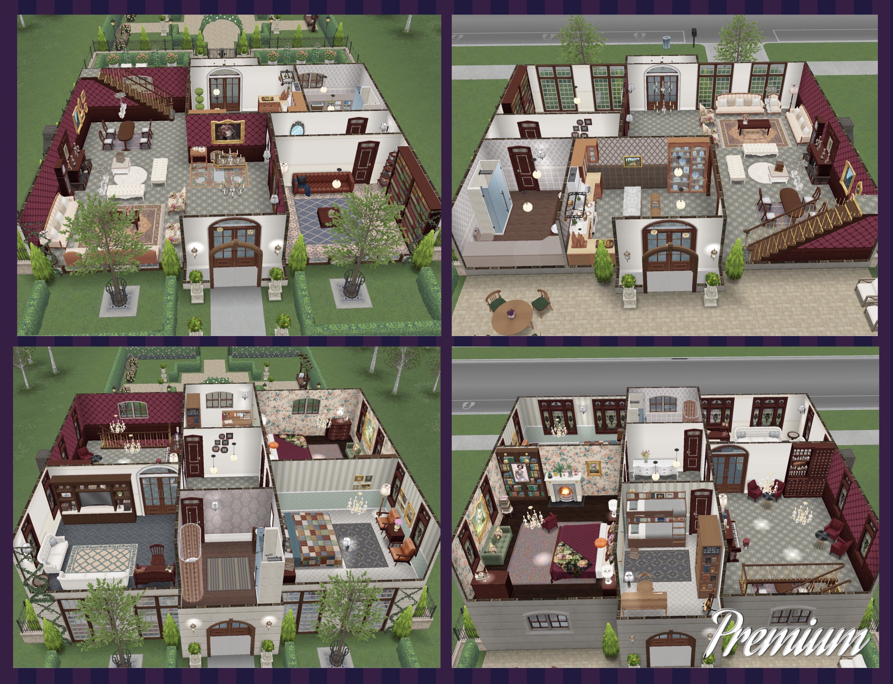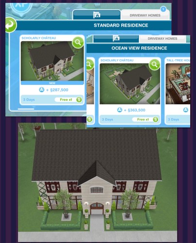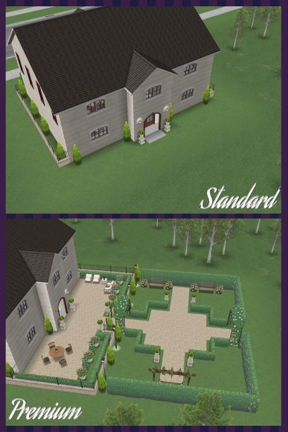 This template can be found under the driveway homes tab and built on a standard or premium residence, the first one is free then they cost simoleons depending on how many houses you have already built. You can add up to 4 cars to this house lot!