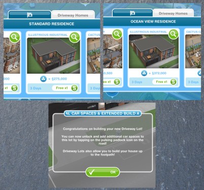 This template can be found under the driveway homes tab and built on a standard or premium residence, the first one is free then they cost simoleons depending on how many houses you have already built. You can add up to 4 cars to this house lot!