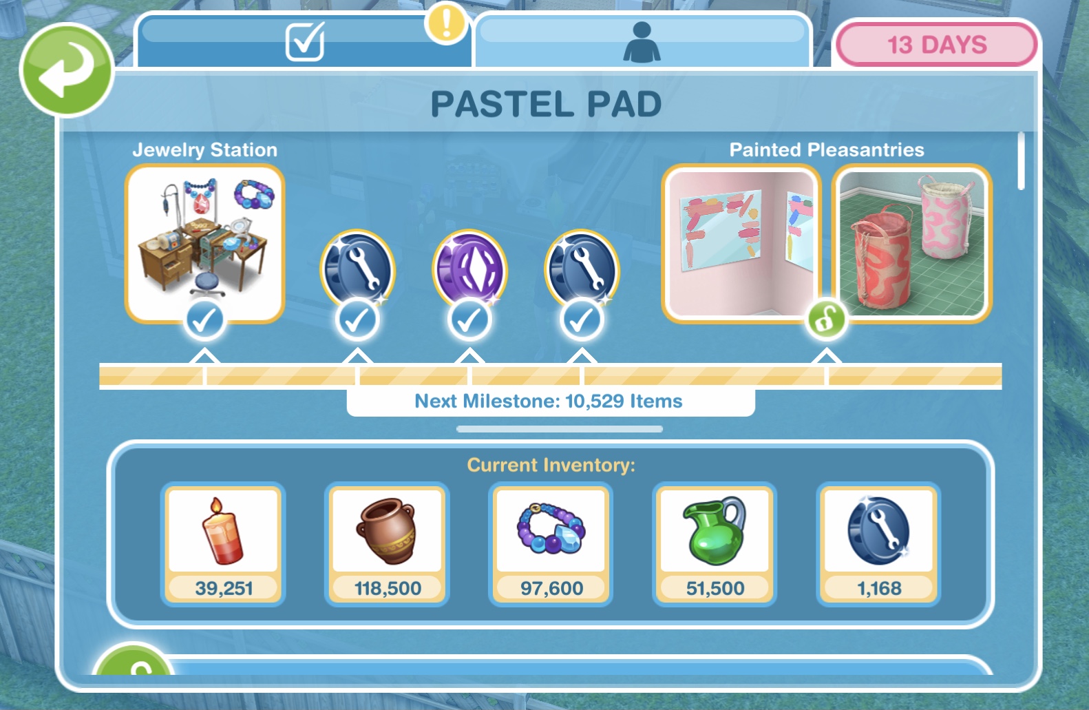Here you will see you have collected enough items to unlock the Mint Mosaics pack. When you unlock each pack, before the items are available in your home store you need to purchase them with the arts and crafts items you make- this goal is coming up!