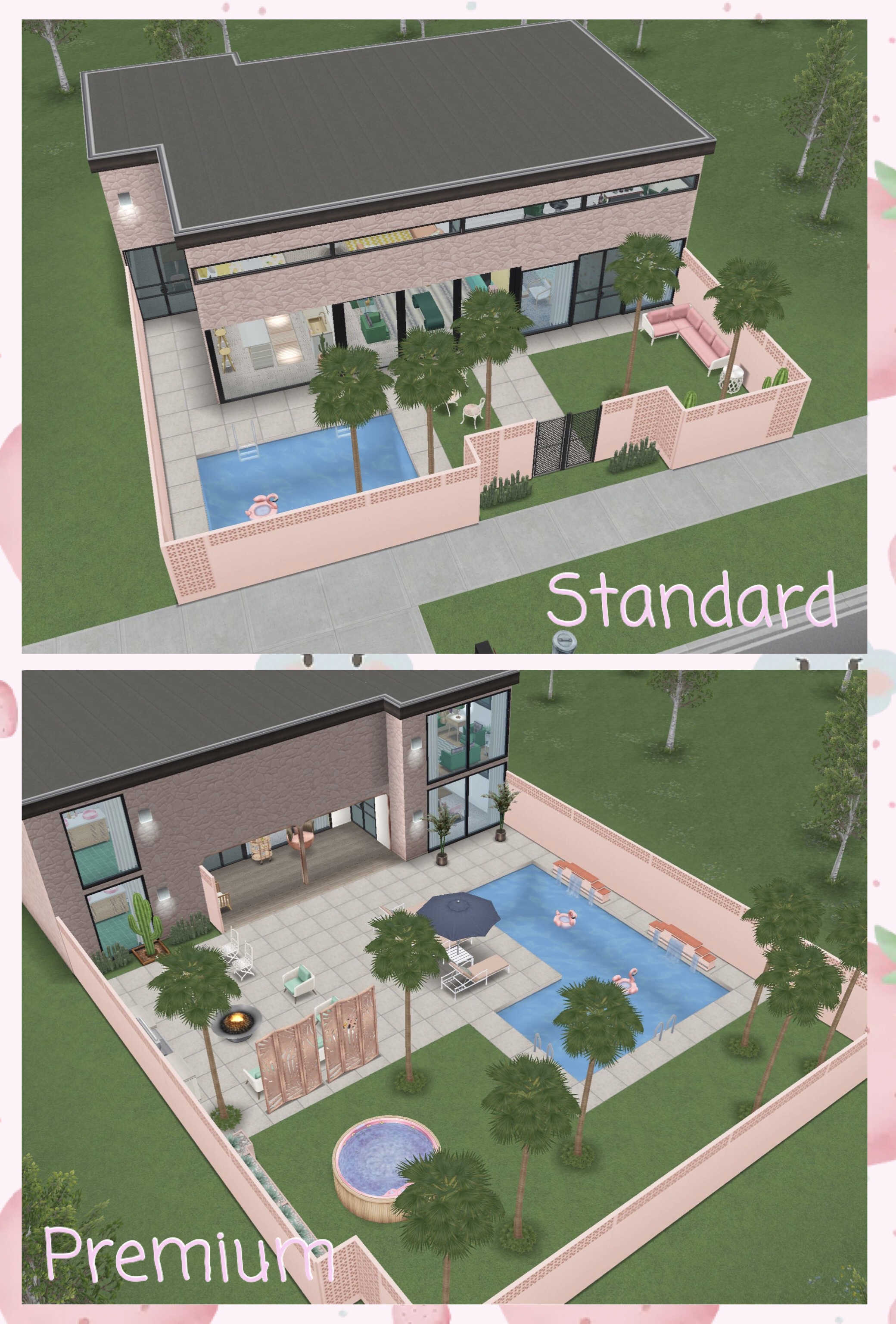 The house is the same on the standard and the premium residence, the premium has a back garden with extra pool, hot tub and garden furniture: