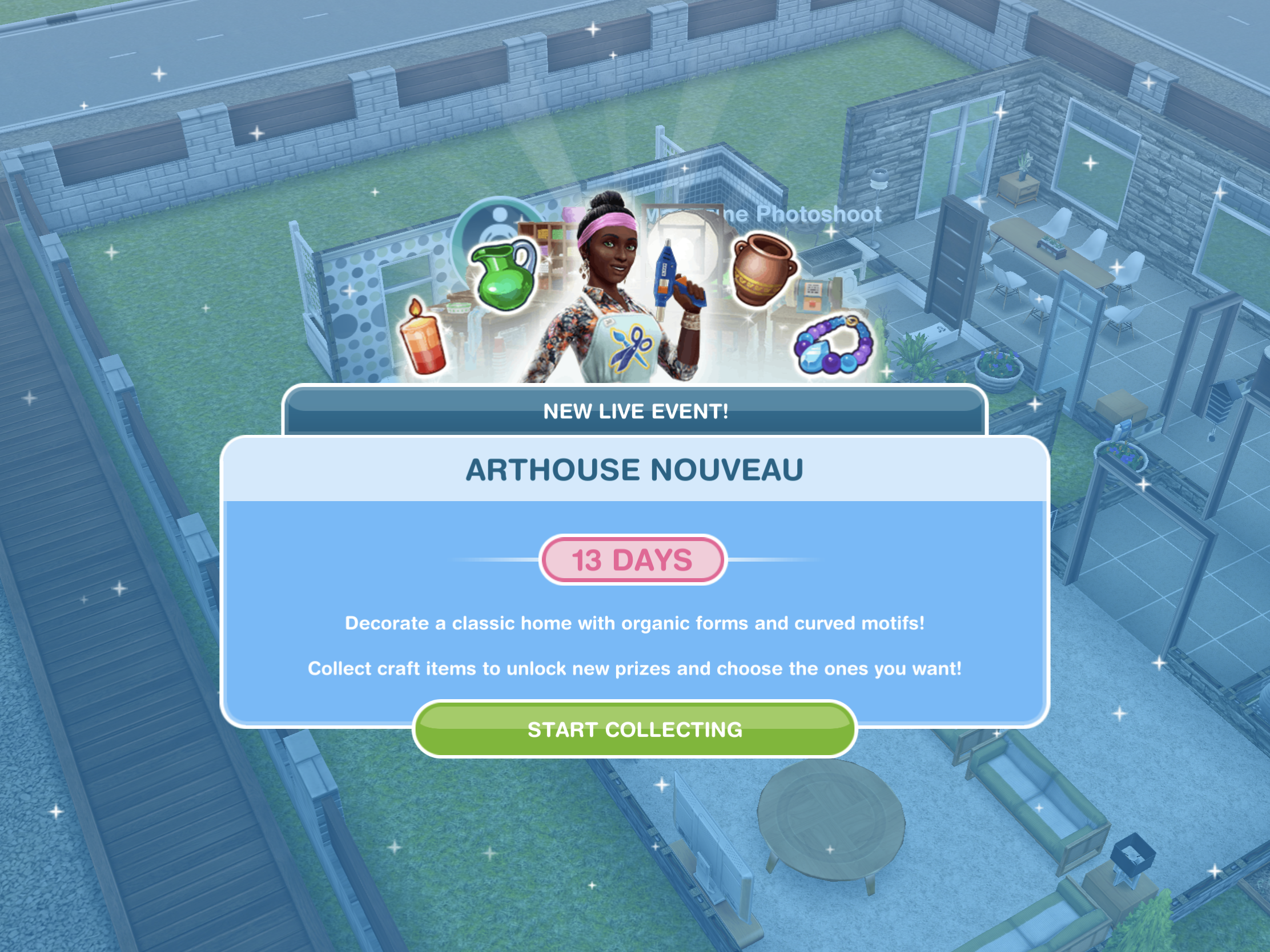 Complete this brand new live event (starts 1st Feb) to unlock romantic French themed items and if you complete the whole event in the time limit you unlock the Arthouse Nouveau house template. This event is only here for 13 days and the aim of it is to collect enough arts and crafts items from the arts and crafts stations (found in the event tab of buy mode) to unlock all the items in this event.