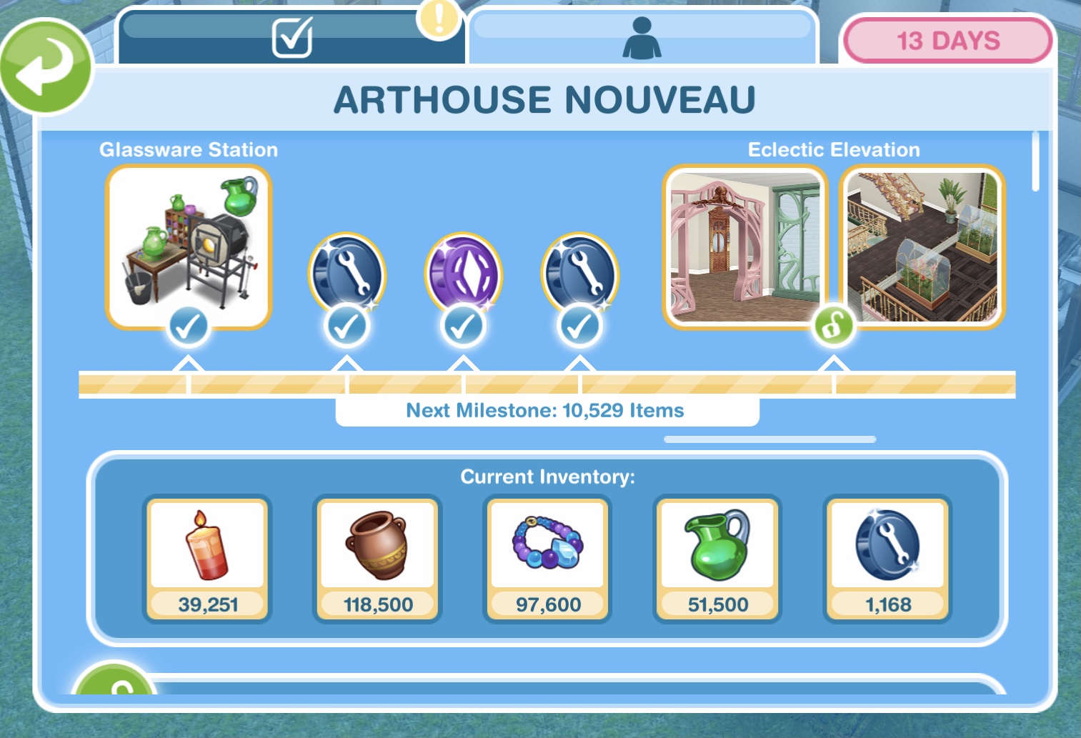 Here you will see you have collected enough items to unlock the Potted Palms pack. When you unlock each pack, before the items are available in your home store you need to purchase them with the arts and crafts items you make- this goal is coming up!
