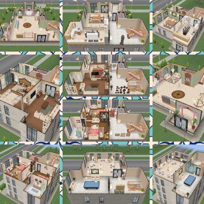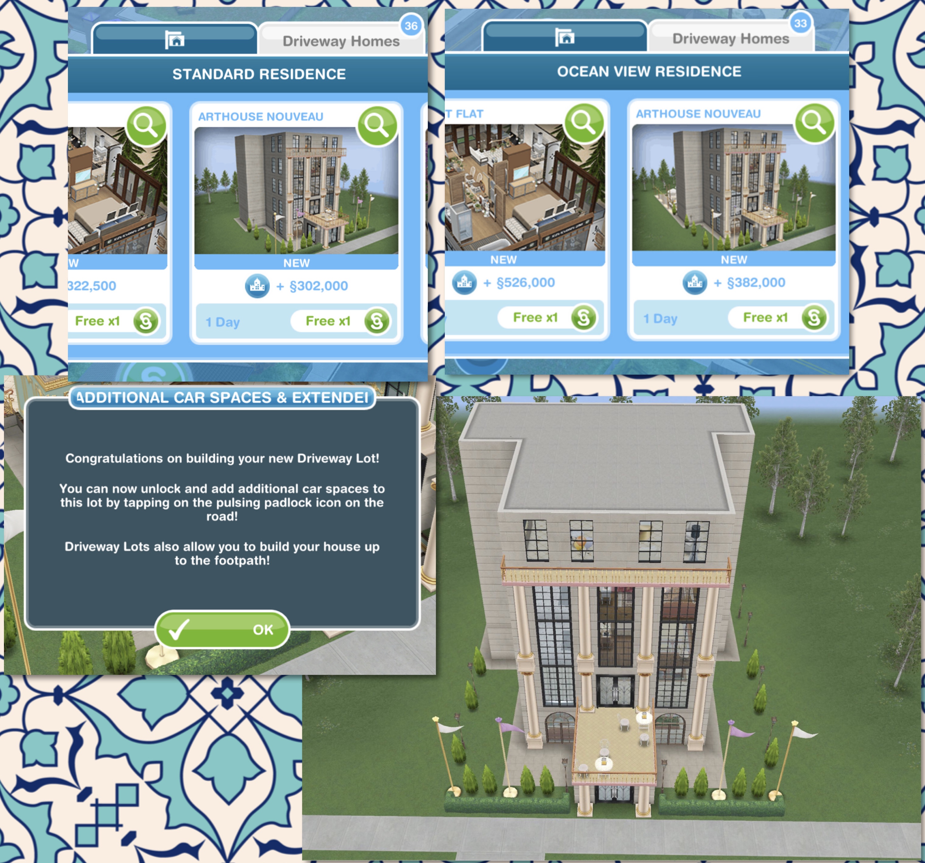This template can be found under the driveway homes tab and built on a standard or premium residence, the first one is free then they cost simoleons depending on how many houses you have already built. You can add up to 4 cars to this house lot!