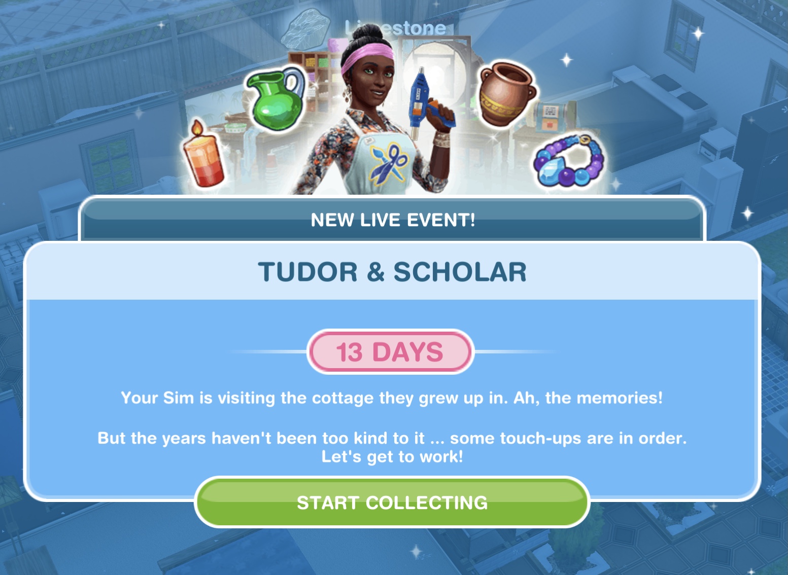 Complete this brand new live event (starts 3rd January) to unlock Tudor themed items and if you complete the whole event in the time limit you unlock the Hamlet Hall house template. This event is only here for 13 days and the aim of it is to collect enough arts and crafts items from the arts and crafts stations (found in the event tab of buy mode) to unlock all the items in this event.