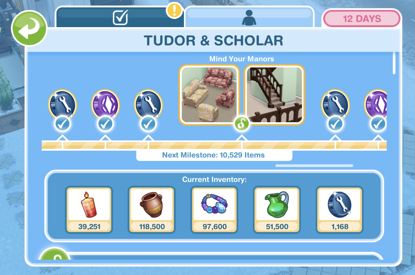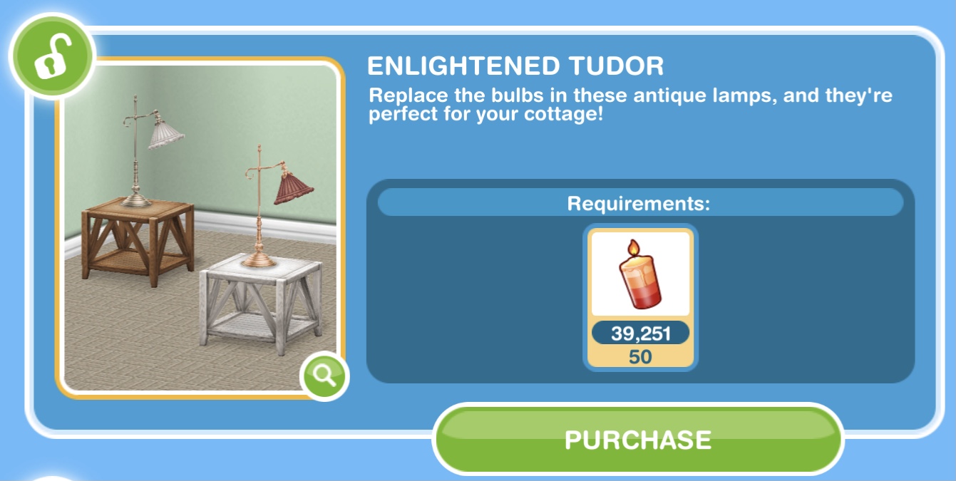 Here you will see you have collected enough items to unlock the Enlightened Tudor pack. When you unlock each pack, before the items are available in your home store you need to purchase them with the arts and crafts items you make- this goal is coming up!