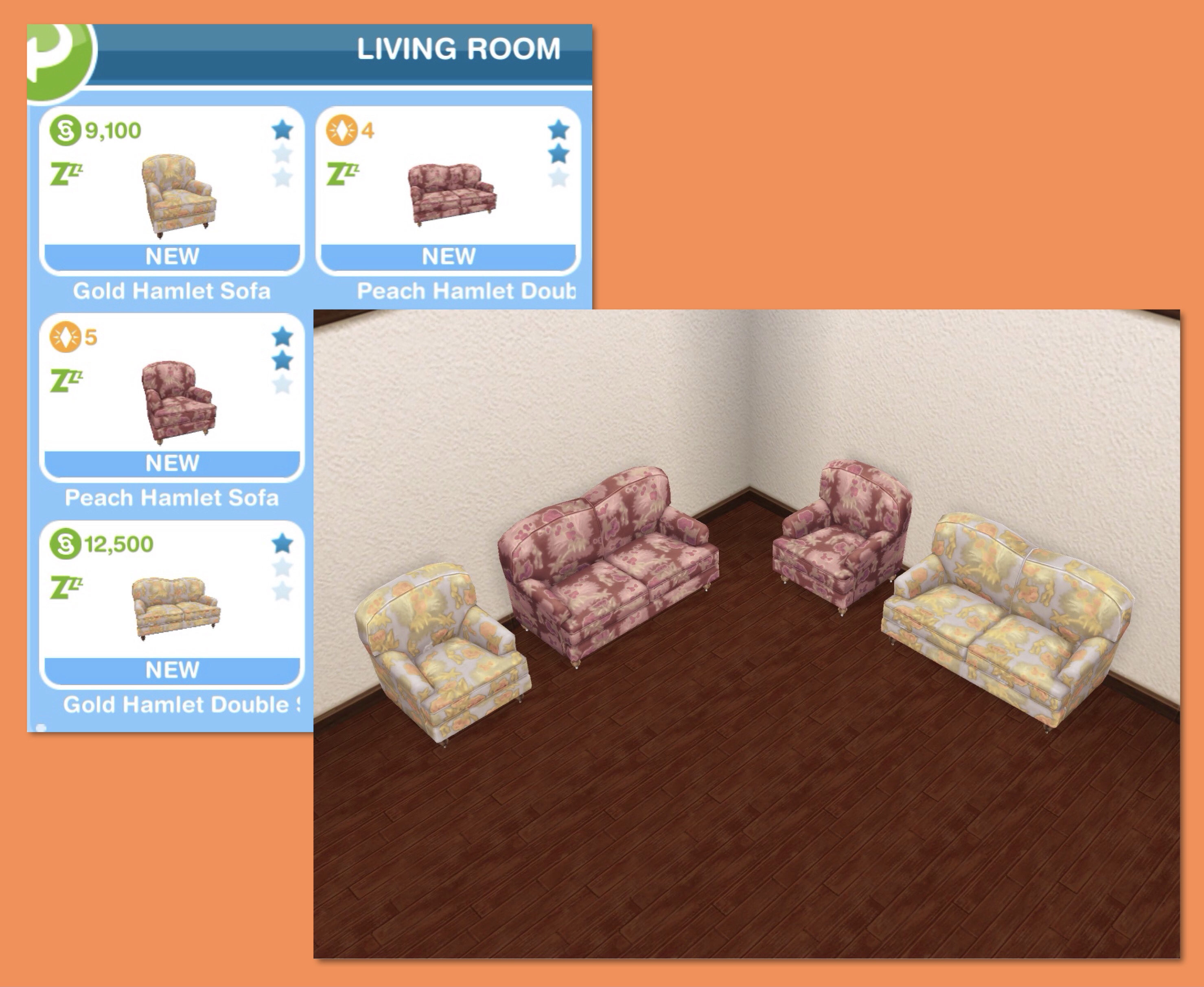 Living Room: Gold (S9,100) and Peach (5LP) Hamlet Sofas