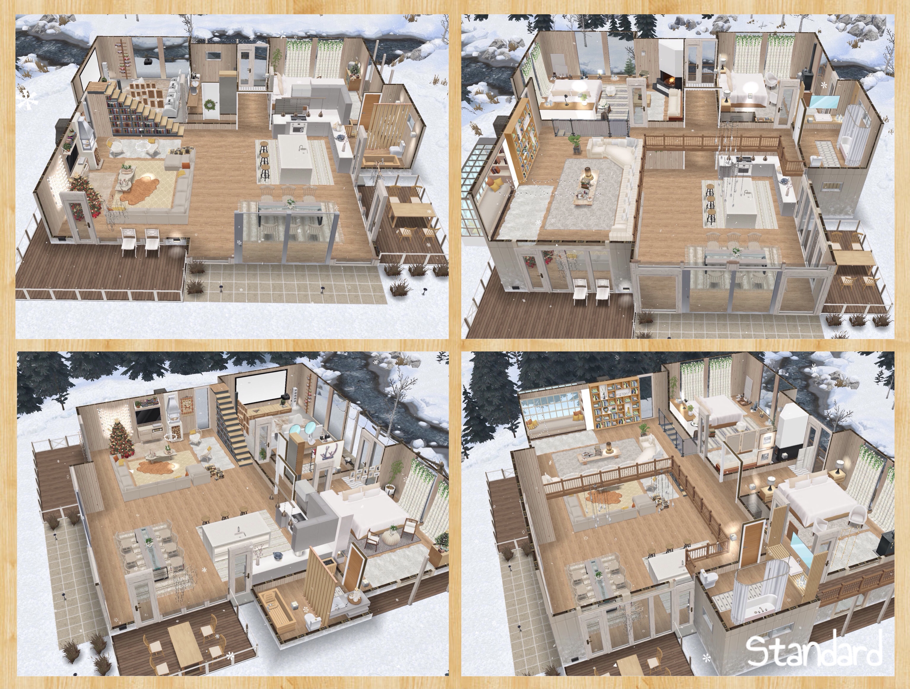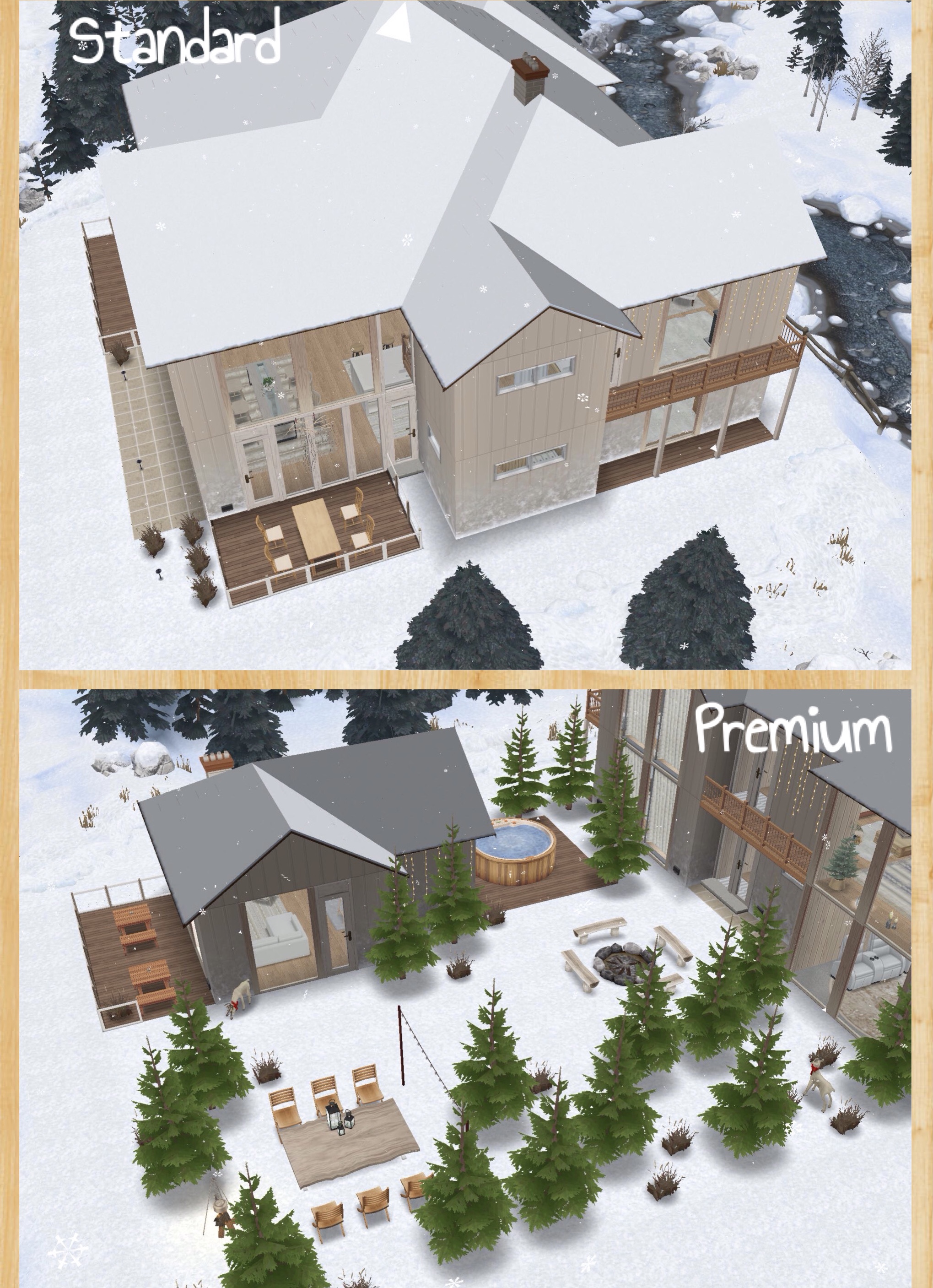 The house is on a snowy lot and it is the same on both house lots but the premium has a garden with a campfire, hot tub and outbuilding: