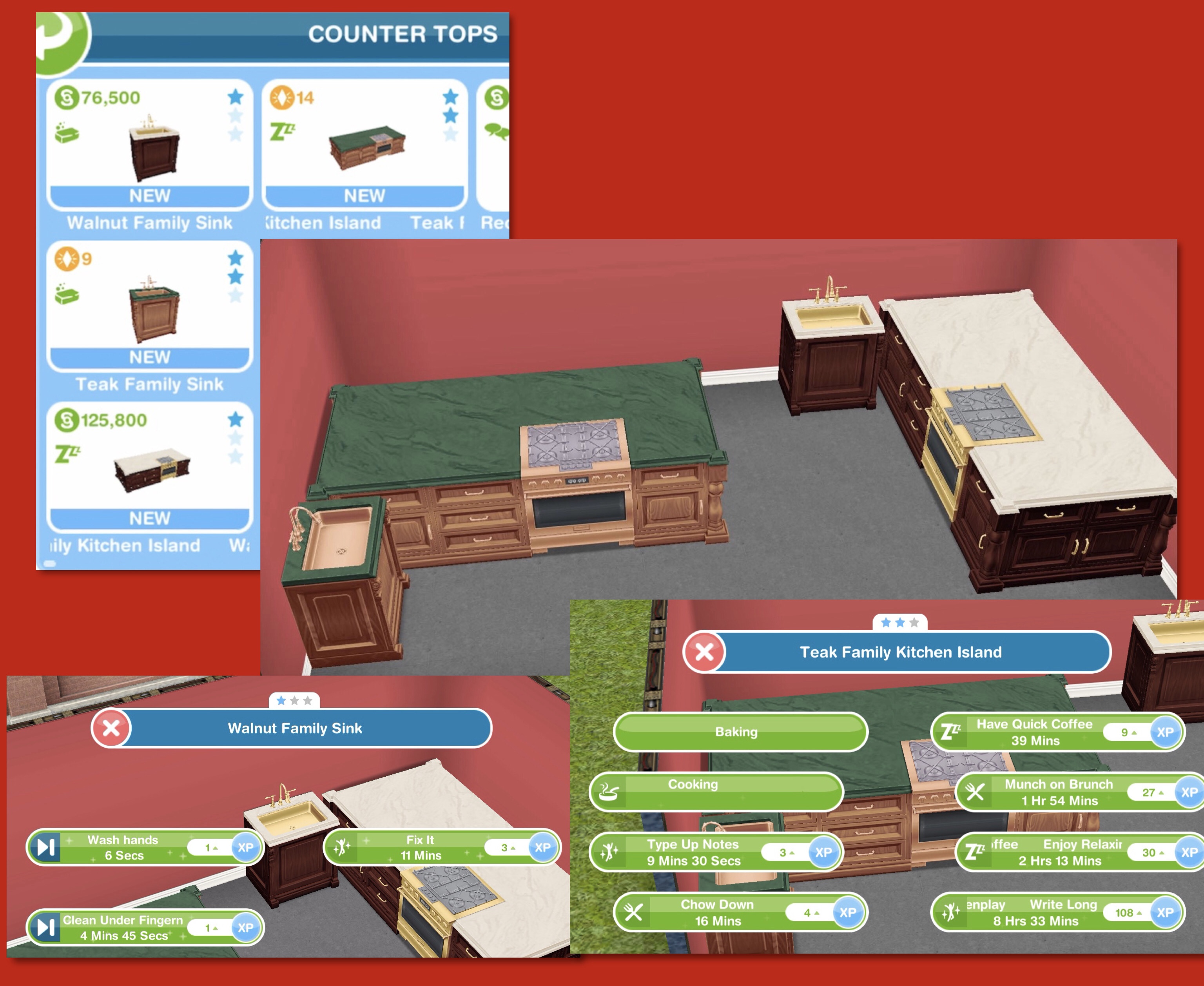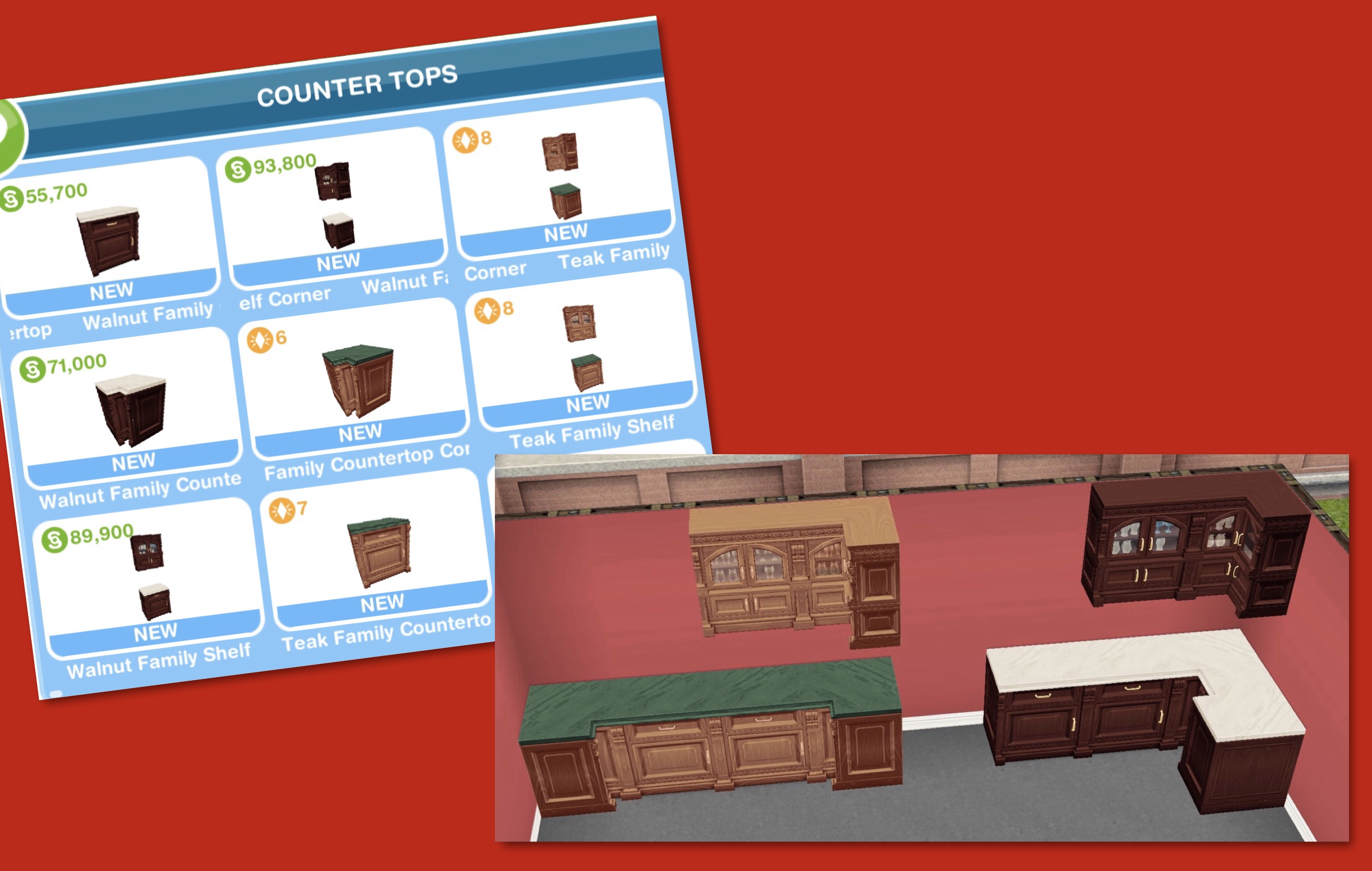 Counter Tops: Walnut Family Countertop (S55,700) Corner (S71,000) Shelf (S89,900) and Corner Shelf (S93,800)