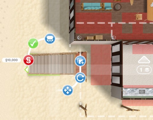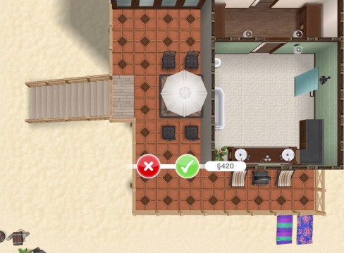 - Click on the item, find a space on the house lot to place it and click on the green tick to buy (it will flash red and the green tick will be greyed out if you cannot place the item)