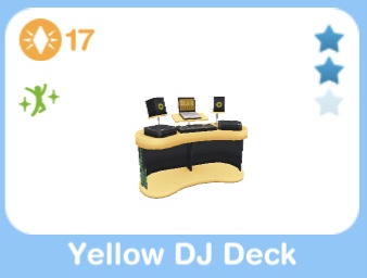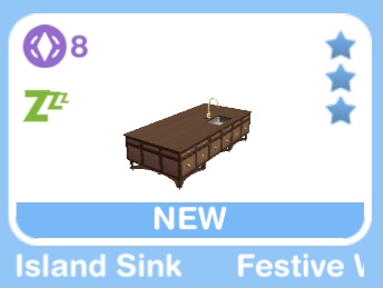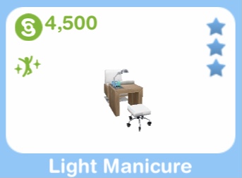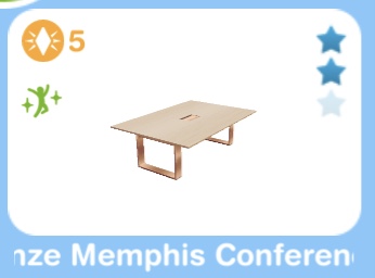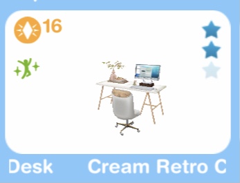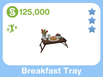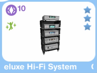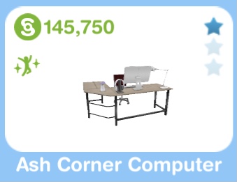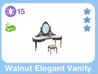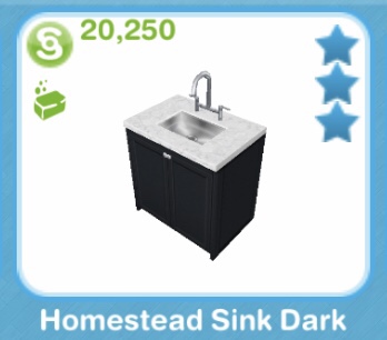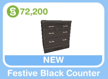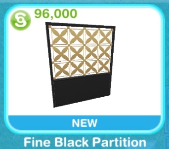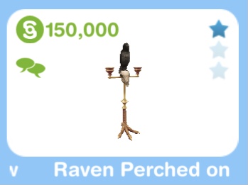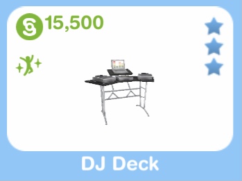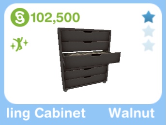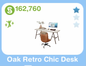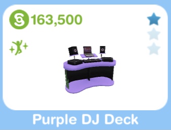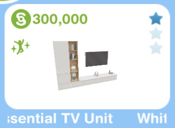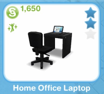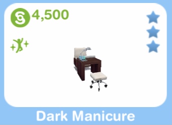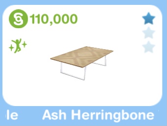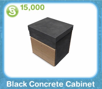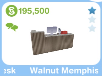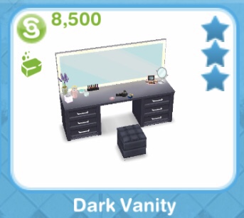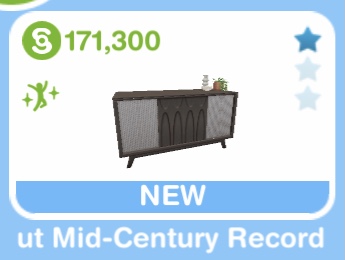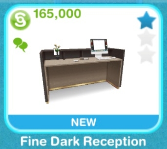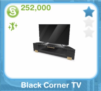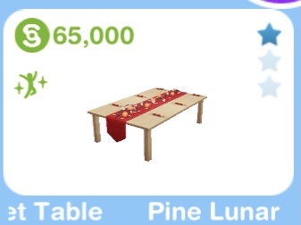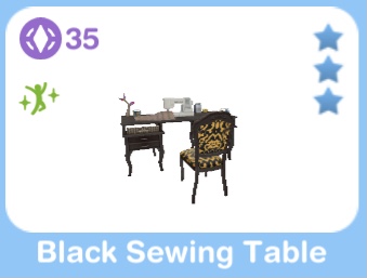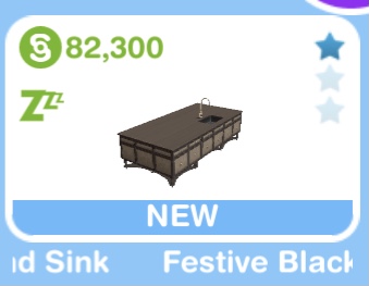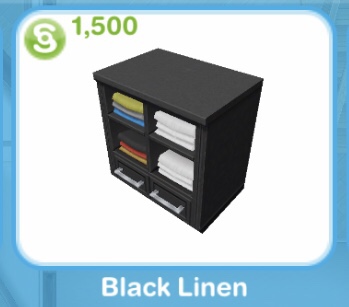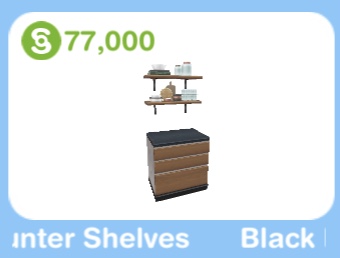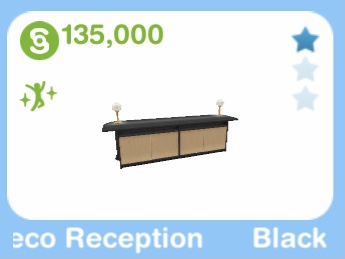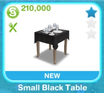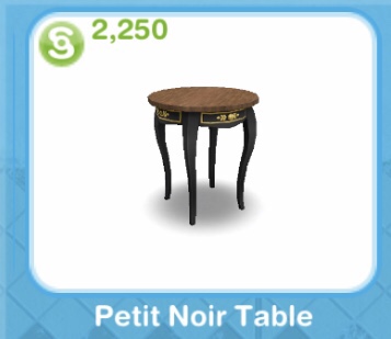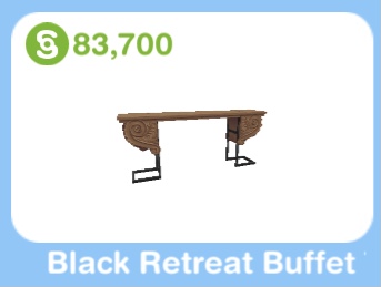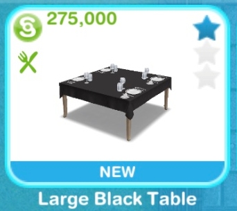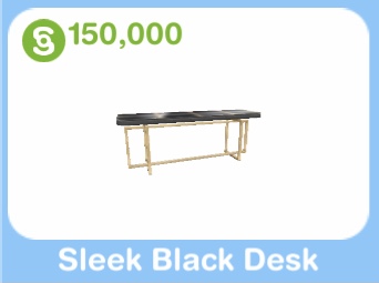 | Sleek Black Desk |  | S150,000 | Holiday High-Rise | S15,000 | -Buffet & Hall Tables -Simoleons -No Stars |