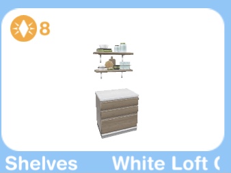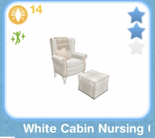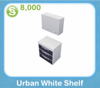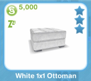 | White 1×1 Ottoman |  | S5,000 | Custom Closets | S500 | -Chairs & Stools -Simoleons -3 Stars |
