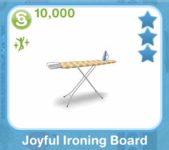 | Joyful Ironing Board |  | S10,000 | Luxury Laundry | S1,000 | -Miscellaneous -Simoleons -3 Stars |