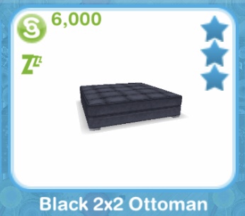 | Black 1×1 Ottoman |  | S5,000 | Custom Closets | S500 | -Chairs & Stools -Simoleons -3 Stars |