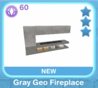 | Gray Geo Fireplace |  | 60SP | Glam Mansion | S3,000 | -Miscellaneous -Socialpoints -3 Stars |