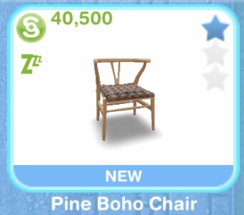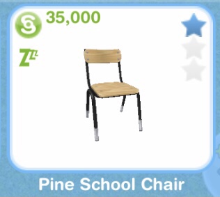 | Pine School Chair |  | S35,000 | School’s Out | S3,500 | -Chairs & Stools -Simoleons -1 Star |