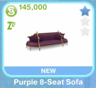 | Purple 8-Seat Sofa |  | S145,000 | Gallery Francais | S14,500 | -Sofa Sets -Simoleons -1 Star |