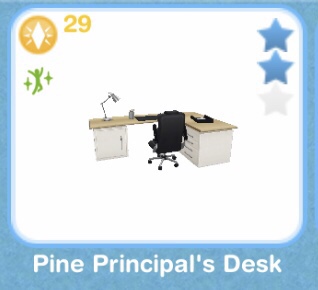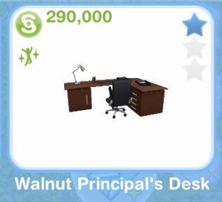 | Walnut Principal’s Desk |  | S290,000 | School’s Out | S29,000 | -Coffee Tables & Desks -Simoleons -1 Star |
