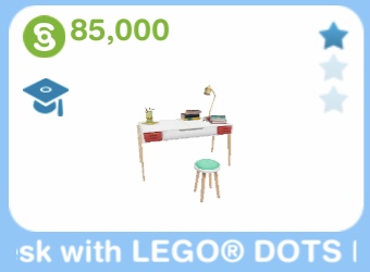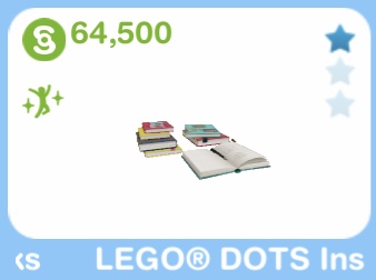 | LEGO® DOTS Inspired Books |  | S64,500 | LEGO® DOTS x The Sims | S6,450 | -Bookcases & Shelving -Simoleons -1 Star |