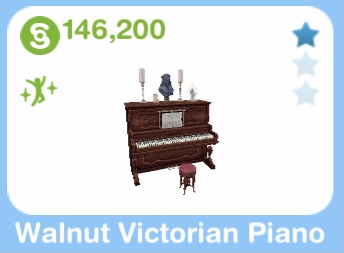 | Walnut Victorian Piano |  | S146,200 | Scholarly Chateau | S14,620 | -Recreation -Simoleons -1 Star |